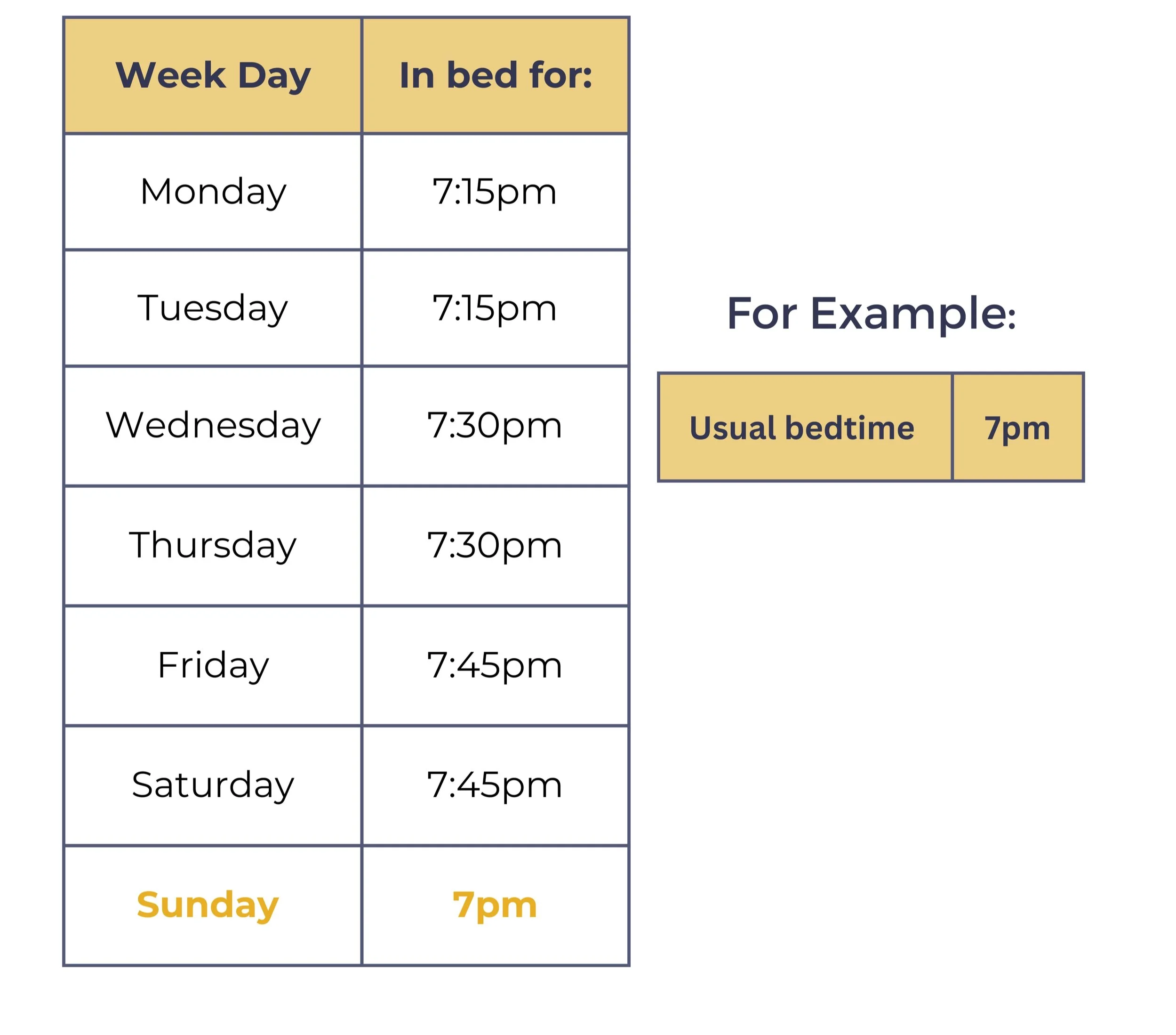 This evening for bedtime, you are going to delay the time you place your little one in their cot/bed by 15 minutes. You can do this by starting the bedtime routine slightly later or making bath time slightly longer for example. You will keep this time for the following night, then every 2 nights delay by another 15 minutes. A small increment of 15 minutes will not cause overtiredness but slowly over the week, you will reach the ‘new’ bedtime of an hour later. See below.