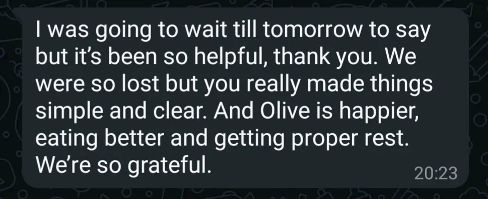 Here is a message Mum sent me at the end of the 2 weeks, Mum is so pleased that Olive’s sleep has improved, but alo her overall wellbeing!