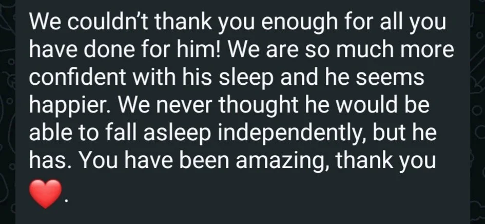 Here is a message Mum sent following the 2 week support. A well rested Mum, ready to go back to work knowing her baby is a confident sleeper.